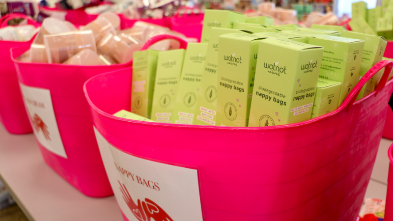 Here is a team member filling up a Mum & Bub bag with our Nappy Bags.